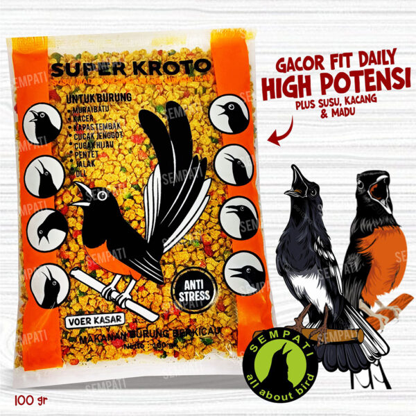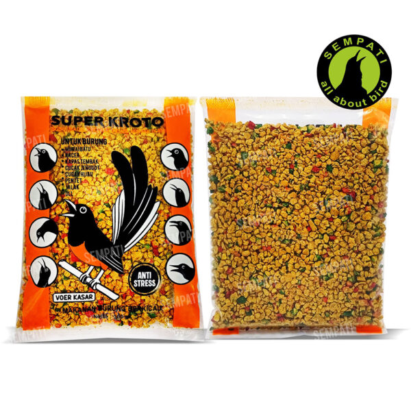 SUPER KROTO adalah pakan burung pemakan serangga yang mengandung gizi tinggi, terbuat dari bahan-bahan pilihan antara lain : tepung susu, tepung jagung, madu, telur, kroto, kacang tanah, kacang kedelai, kacang hijau.